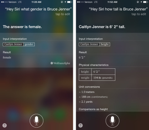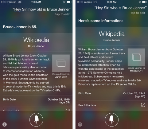 Έτσι, όταν η ερώτηση αφορούσε την ηλικία ή πληροφορίες για τον Μπρους Τζένερ, η Siri δεν διορθώνει αυτομάτως τον χρήστη αναφερόμενη στην Κέιτλιν, κι αυτό καθώς αντλεί ή παραπέμπει για την απάντηση στην Wikipedia. Οι «σωστές» απαντήσεις στα προηγούμενα ερωτήματα αντλήθηκαν από την επιστημονική μηχανή αναζήτησης, τον Wolfram Alpha.