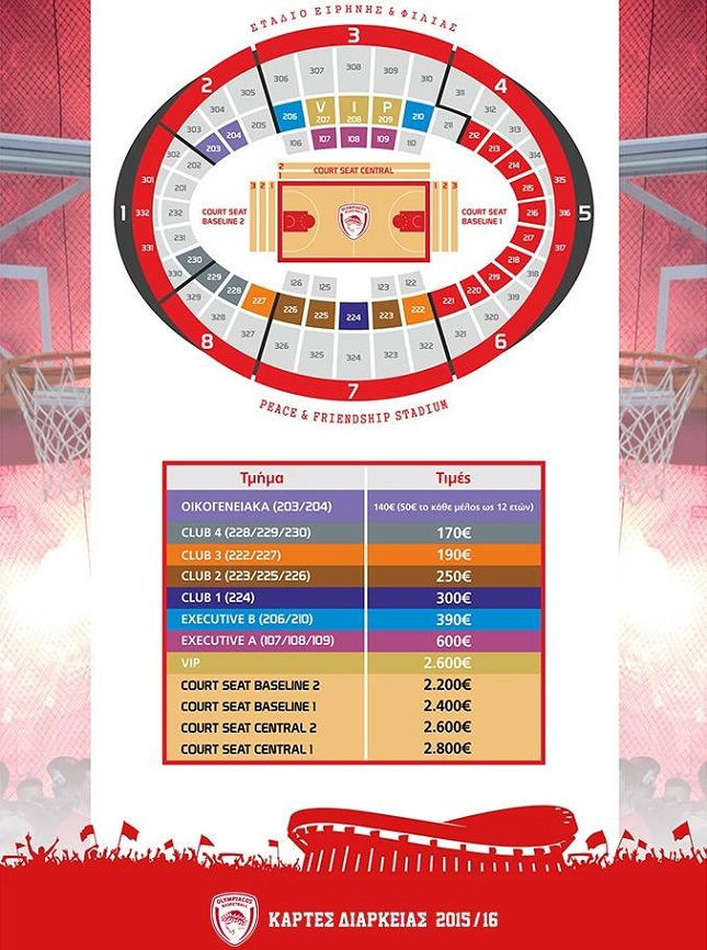 Hανανέωση και διάθεση των καρτών διαρκείας των κατηγοριώνExecutiveAκαιVIP/Court-seats, καθώς και των οικογενειακών εισιτηρίων θα πραγματοποιείται μόνο από τα γραφεία της ΚΑΕ ΟΛΥΜΠΙΑΚΟΣ.