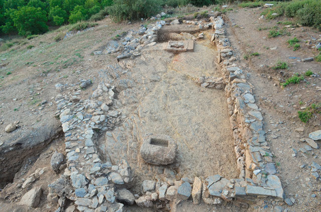 Το ιερό γυναικείας θεότητας στο ανατολικό πλάτωμα της Ακρόπολης της αρχαίας Φενεού. Διακρίνονται η βάση λατρευτικού αγάλματος και η πήλινη εσχάρα