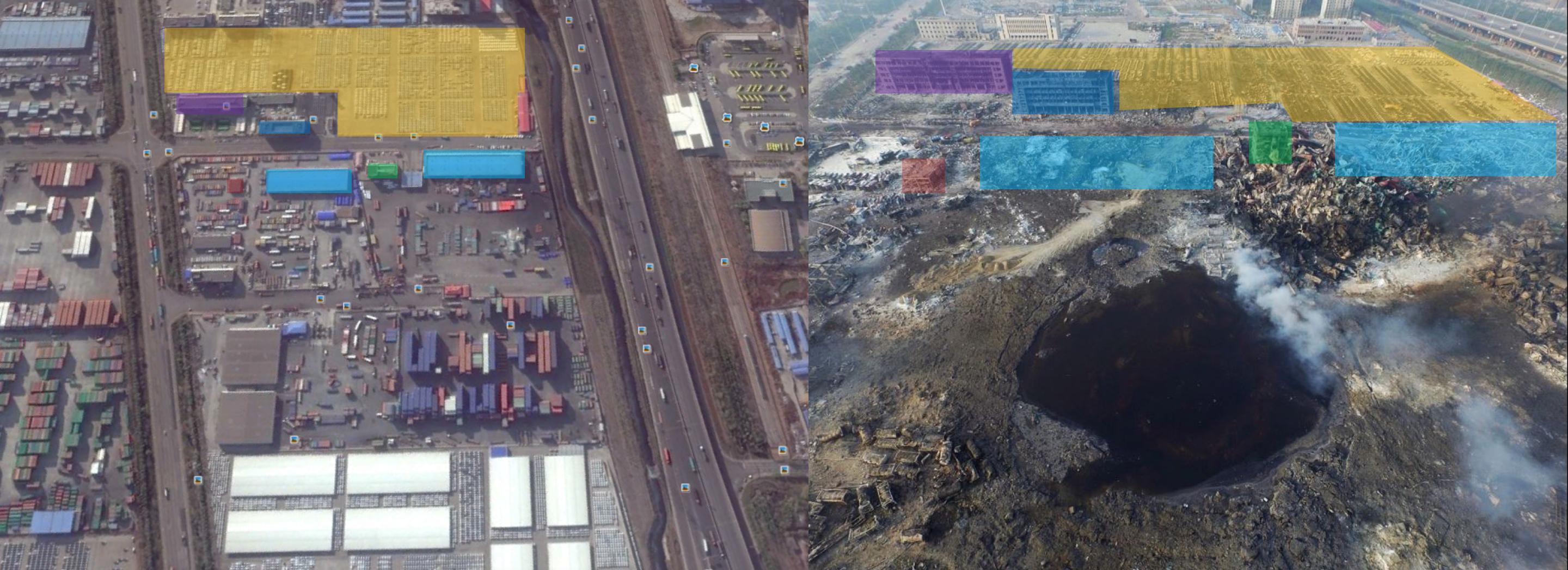 Ο φωτογραφικός φακός έχει συλλάβει τον τεράστιο κρατήρα που έχει σχηματιστεί στο σημείο που πριν βρίσκονταν οι αποθήκες με τις επικίνδυνες χημικές ουσίες.