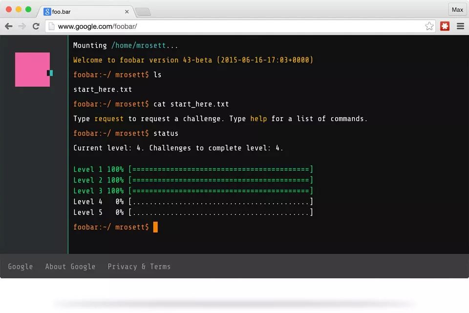 Η ιστορία του Rosett ξεκινά ψάχνοντας κάτι για τις συναρτήσεις λ της γλώσσας Python, εισάγοντας τους όρους “python lambda function list comprehension.” Καθώς κοιτούσε διερευνητικά τα αποτελέσματα, κάτι ασυνήθιστο συνέβη. Η λίστα των αποτελεσμάτων διαιρέθηκε και εμφανίστηκε στην μέση ένα κουτί που του απηύθυνε το μήνυμα “You’re speaking our language. Up for a challenge?” («Μιλάς την γλώσσα μας, τι θα έλεγες για μια πρόκληση;»). Έκπληκτος, αποφάσισε να αναλάβει την πρόκληση που τον οδήγησε στο “foo.bar.” Στην γραμμή εντολών που θύμιζε το περιβάλλον UNIX, ο Rosett πληκτρολόγησε την εντολή που φέρνει την λίστα των αρχείων ls, που εμφάνισε το αποκαλυπτικό αρχείο κειμένου “start_here.txt”. Στο εσωτερικό του, δύο ακόμα πληροφορίες για το τι έπρεπε να κάνει στην συνέχεια:
