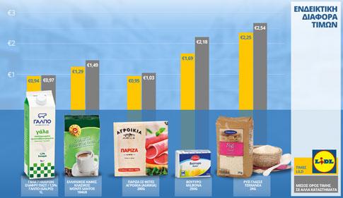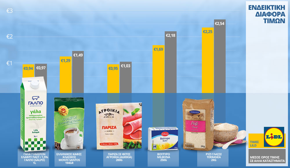 Ενδεικτικά, αναφέρεται ότι εάν ο καταναλωτής επιλέξει για το γεύμα του ρύζι γλασέ Terranea και 200 γρ. πάριζα Αγροικία, θα χρειαστεί να καταβάλλει το ποσό των 3,20 ευρώ συνολικά, εφόσον πραγματοποιήσει τις αγορές του από την αλυσίδα Lidl. Αντιθέτως, εάν επιλέξει τα ίδια προϊόντα από άλλες αλυσίδες, θα πρέπει να καταβάλλει το ποσό των 3,575 ευρώ. Συγκεκριμένα, το ρύζι γλασέ Terranea στα Lidl κοστίζει 2,25 ευρώ και τα 200 γρ. πάριζας Αγροικία 0,95 ευρώ. Ο μέσος όρος της αγοράς στα ίδια προϊόντα, ανέρχεται στα 2,54 ευρώ και στα 1,035 αντίστοιχα.