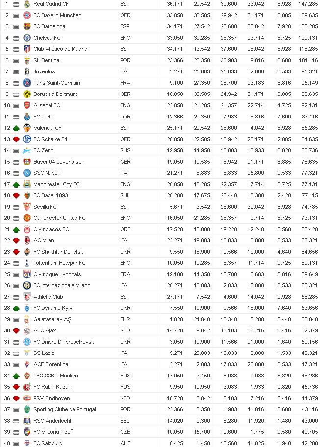 Στην πρώτη θέση βρίσκεται η Ρεάλ Μαδρίτης με 147.285 ενώ ακολουθούν η Μπάγερν Μονάχου με 139.635 και η Μπαρτσελόνα με 136.285. Την πρώτη πεντάδα συμπληρώνουν Τσέλσι (122.131) και Ατλέτικο Μαδρίτης (118.285). Η σειρά των ελληνικών ομάδων: 21. ΟΛΥΜΠΙΑΚΟΣ 66.420 56. ΠΑΟΚ 31.920 111. ΠΑΝΑΘΗΝΑΙΚΟΣ 14.420 119. ΑΣΤΕΡΑΣ ΤΡΙΠΟΛΗΣ 13.420 141. ΑΤΡΟΜΗΤΟΣ 10.920 192. ΑΕΚ 7.420 216. ΞΑΝΘΗ 6.420 217. ΟΛΥΜΠΙΑΚΟΣ ΒΟΛΟΥ 6.420 Δείτε τις πρώτες 40: