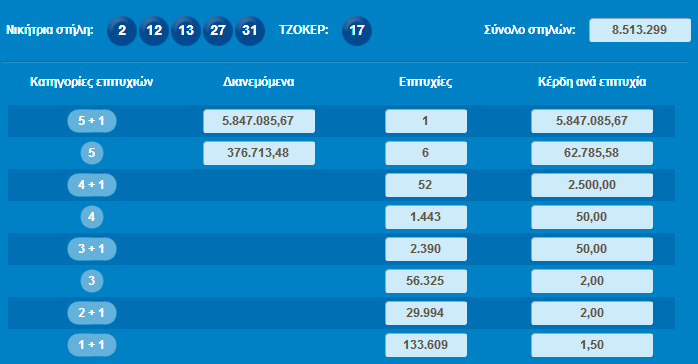 Έναν υπερτυχερό ο οποίος κερδίζει 5.847.085 ευρώ ανέδειξε η κλήρωση του Τζόκερ την Πέμπτη. Οι τυχεροί αριθμοί είναι: 2, 12, 13, 27, 31 και τζόκερ το 17. Συνολικά παίχθηκαν παίχθηκαν περισσότερες από 8,5 εκατομμύρια στήλες.
