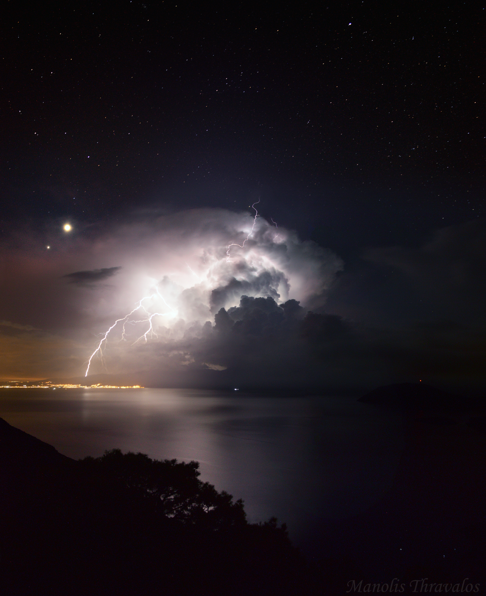 «Απίστευτη η δυναμική της καταιγίδας με συνεχόμενες λάμψεις. Κατά διαστήματα κεραυνοί έπεφταν σε απόσταση χιλιομέτρων. Καταιγίδa-«λαμπατέρ» και από πάνω τα αστέρια…» περιγράφει ο χομπίστας φωτογράφος που τράβηξε τη συγκεκριμένη φωτογραφία.