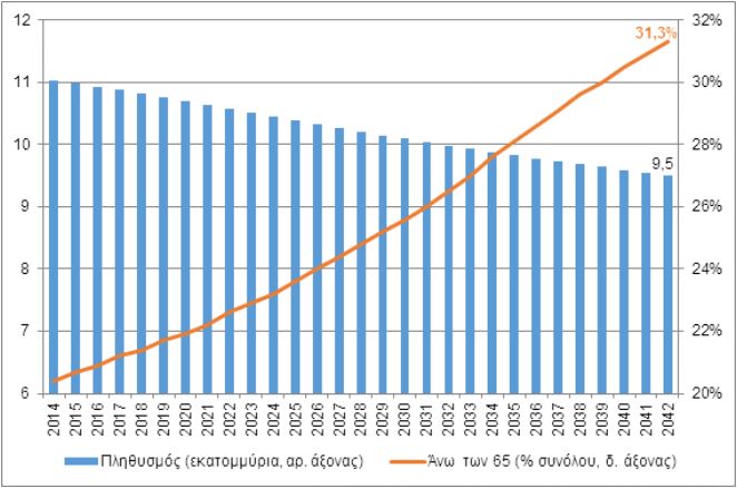Διάγραμμα 1: Εξέλιξη του ελληνικού πληθυσμού και της αναλογίας άνω των 65 στο σύνολο του πληθυσμού σύμφωνα με το βασικό σενάριο της Eurostat (2014- 2042). Πηγή: Eurostat.
