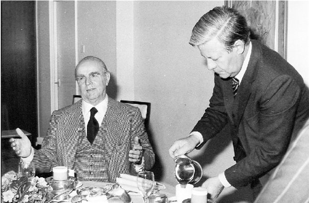 Στην φωτογραφία (1977) ο Σμιτ σερβίρει καφέ στον τότε έλληνα πρωθυπουργό, Κωνσταντίνο Καραμανλή. Οι δύο άνδρες είχαν αναπτύξει φιλική σχέση