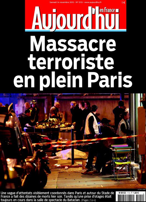 Με τίτλο «Σφαγή απο τρομοκράτες σε όλο το Παρίσι» θα κυκλοφορήσει η «Aujourd’hui».