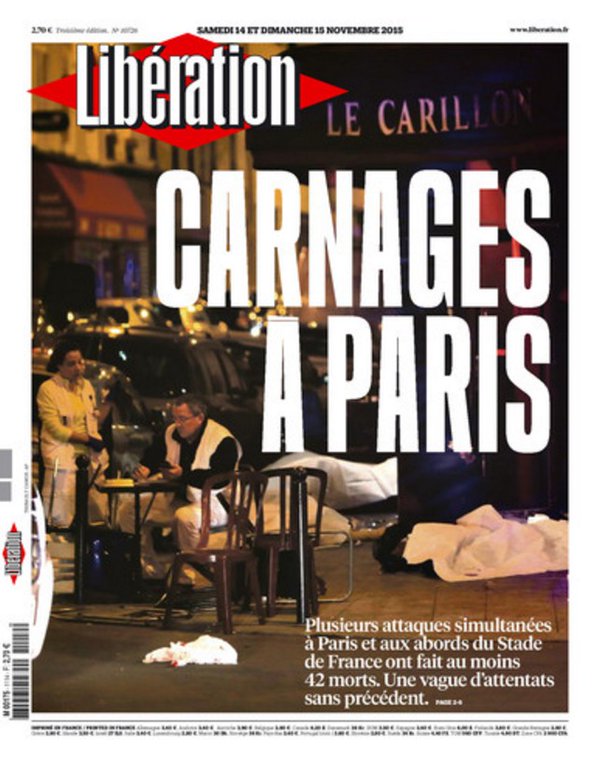 «Αιματοχυσία στο Παρίσι», είναι ο τίτλος της «Liberation», «Ένα κύμα θανάτου χωρίς προηγούμενο» συνεχίζει. Αξίζει να σημειωθεί πως η φωτογραφία στο εξώφυλλο της είναι σύμφωνα με το πρακτορείο «Reuters», η φωτογραφία της ημέρας. Με τον πρωτοσέλιδο τίτλο «φρίκη» να αναγράφεται με άσπρα γράμματα σε μαύρο φόντο θα κυκλοφορήσει το Σάββατο η γαλλική αθλητική εφημερίδα «L’ equipe» λίγες μόλις ώρες μετά τα τραγικά γεγονότα και τις επιθέσεις το βράδυ της Παρασκευής που στέρησαν τη ζωή σε εκατοντάδες ανθρώπους. «Τρομοκρατικές επιθέσεις συνέβησαν στα περίχωρα του »Stade de France», στο Saint-Denis και στο Παρίσι χθες. Λίγο μετά τα μεσάνυχτα ο αριθμός των νεκρών έφτανε τους 40», αναφέρει επίσης στο πρωτοσέλιδο της.