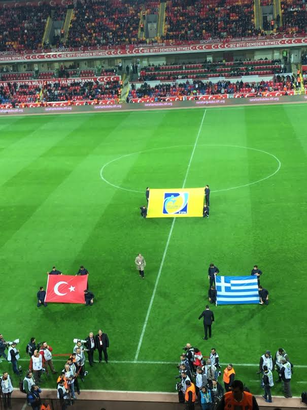 Τον αγώνα παρακολουθούν μαζί ο Έλληνας πρωθυπουργός, Αλέξης Τσίπρας και ο ομόλογός του, Αχμέτ Νταβούτογλου. Μάλιστα, αξίζει να αναφερθεί πως το γεγονός ότι οι δύο πρωθυπουργοί των χωρών παρακολουθούν μαζί έναν αγώνα Ελλάδας – Τουρκίας, ή Τουρκίας – Ελλάδας, συμβαίνει για πρώτη φορά στα χρονικά. Ποτέ άλλοτε δεν είχαν συναντηθεί στο ίδιο γήπεδο οι δύο αρχηγοί των κρατών, αντίθετα, είχαν προηγηθεί τετ-α-τετ μεταξύ υφυπουργών Αθλητισμού ή υπουργών εξωτερικών.