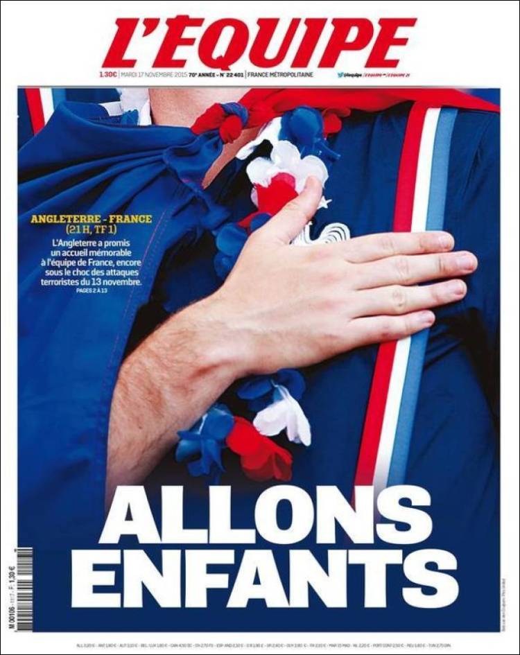 Ενώ και η γαλλική «Equipe» κυκλοφορεί με το πρωτοσέλιδο «Πάμε παιδιά» και συμπληρώνει: «η Αγγλία υποσχέθηκε ένα αξέχαστο καλωσόρισμα στην εθνική ομάδα της Γαλλίας, η οποία βρίσκεται ακόμα σε κατάσταση σοκ από τις τρομοκρατικές επιθέσεις της 13ης Νοεμβρίου».