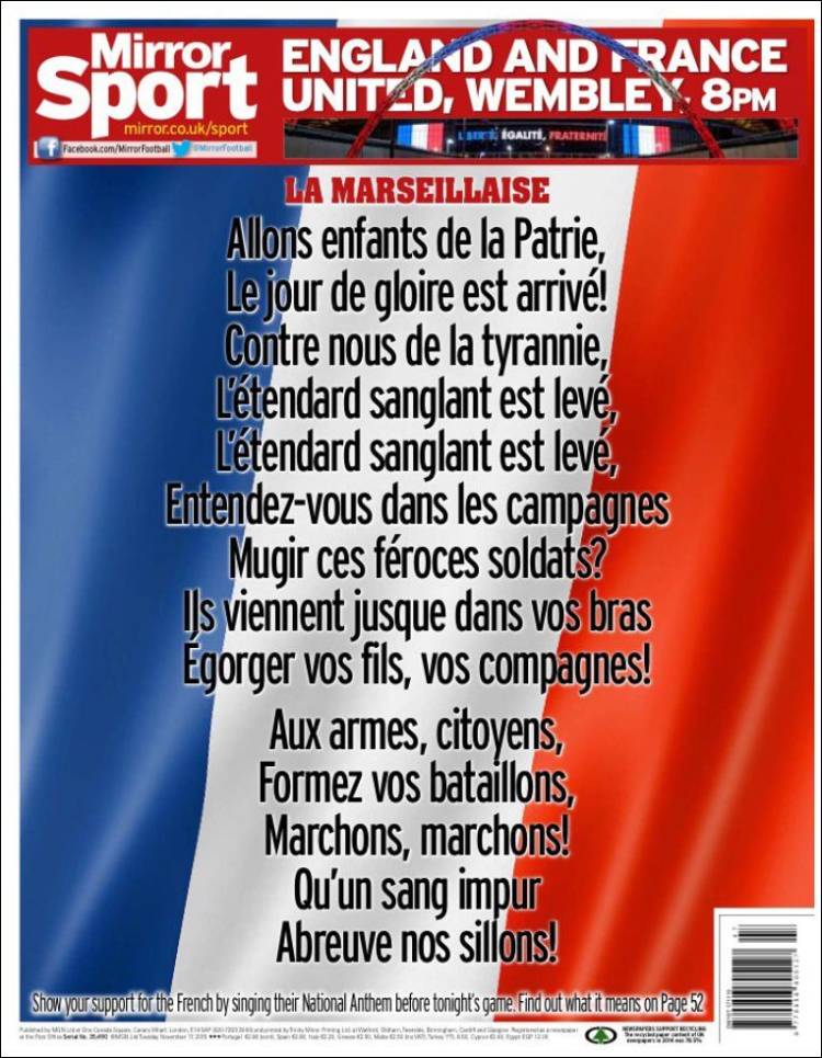 Σε αυτό το κλίμα κινούνται και τα πρωτοσέλιδα των αθλητικών εφημερίδων στην Αγγλία, τα οποία σε ένδειξη αλληλεγγύης κυκλοφόρησαν με εξώφυλλο τον εθνικό ύμνο της Γαλλίας.
