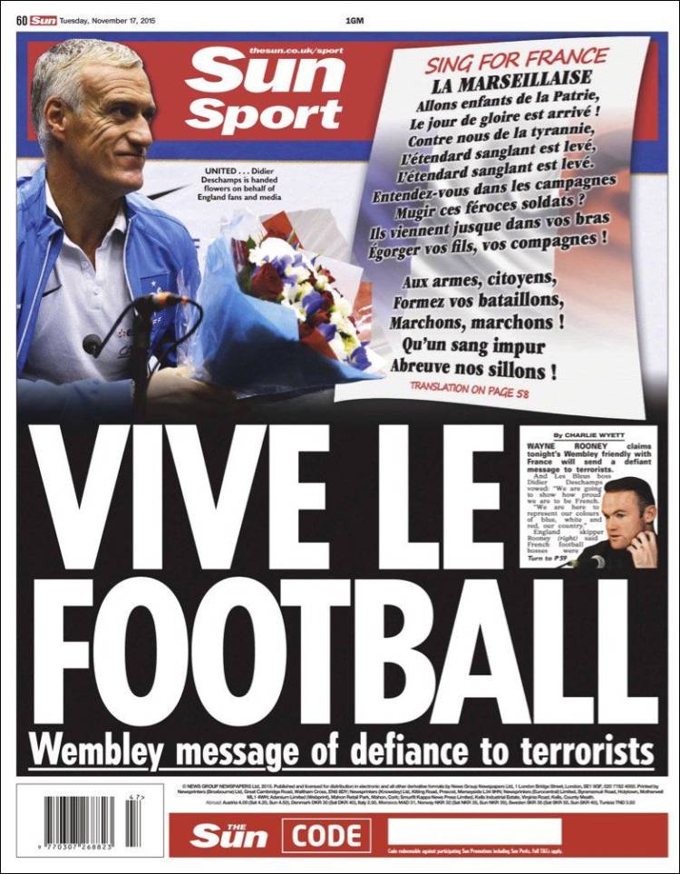 Συγκεκριμένα η αθλητική έκδοση της «Mirror» μαζί με τη «Μασσαλιώτιδα» αναφέρει: «Αγγλία και Γαλλία ενωμένες στο »Wembley»» καθώς και η «Sun» συμπληρώνει: «Ζήτω το ποδόσφαιρο. Μήνυμα του Γουέμπλεϊ κατά της τρομοκρατίας».