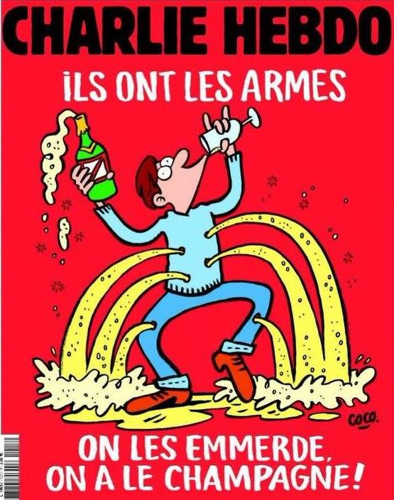 Στην πρώτη του απάντηση στις τρομοκρατικές επιθέσεις του Παρισιού, το γαλλικό περιοδικό που τον περασμένο Ιανουάριο έγινε ο πρώτος στόχος του Ισλαμικού Κράτους στο Παρίσι, κυκλοφορεί με ένα σκίτσο της Coco: έναν κατατρυπημένο από τις σφαίρες άνδρα, από τις πληγές του οποίου ρέει άφθονη η σαμπάνια.