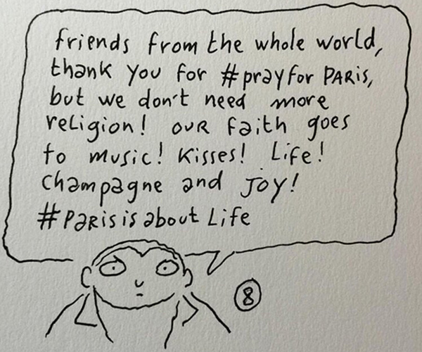 «Φίλοι από όλο τον κόσμο, ευχαριστούμε για την #προσευχή_για_το_Παρίσι (#prayforparis), αλλά δεν χρειαζόμαστε περισσότερη θρησκεία! Η πίστη μας είναι στη μουσική! Στα φιλιά! στη ζωή! Τη σαμπάνια και τη χαρά! #Parisisaboutlife (Το Παρίσι είναι τρόπος ζωής)» λέει ο οργισμένος παριζιάνος που εμφανίζεται στο σκίτσο.