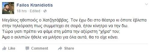 Αντιδράσεις στα κοινωνικά δίκτυα προκάλεσε το σχόλιο του Φαήλου Κρανιδιώτη, επί χρόνια συνεργάτη του Αντώνη Σαμαρά για τον σύντροφο του Μηνά Χατζησάββα. Ο ίδιος έλαβε εκατοντάδες «likes» για την άποψή του, αλλά εξίσου πολλά αρνητικά σχόλια. Επανήλθε δε με νέο σχόλιο.