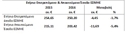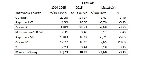 Η μείωση του απαιτούμενου εσόδου του ΕΤΜΕΑΡ για το 2016 ανέρχεται στα 130 εκ. € (από ~1067 εκ. € εκτιμώμενα έσοδα του Ειδικού Λογαριασμού από ΕΤΜΕΑΡ κατά το 2015, σε ~937 εκ. € το 2016). Το γεγονός αυτό οδηγεί, όπως προκύπτει από τα στοιχεία του Πίνακα 1, σε μεσοσταθμική μείωση των χρεώσεων ΕΤΜΕΑΡ για το 2016 κατά 8.1%, σε σχέση με τις αντίστοιχες χρεώσεις των ετών 2014-2015.