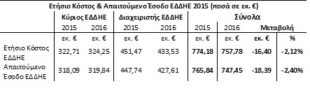 Το ετήσιο κόστος και το απαιτούμενο έσοδο για τη χρήση του ΕΔΔΗΕ για το έτος 2016 μειώθηκαν κατά 2,1% και 2,4% αντίστοιχα, σε σχέση με το 2015, όπως φαίνεται στον πίνακα 2 που ακολουθεί, επιφέροντας αντίστοιχη μείωση των τιμολογίων χρήσης του ΕΔΔΗΕ: