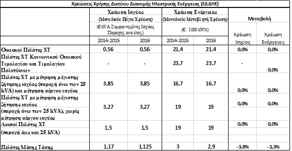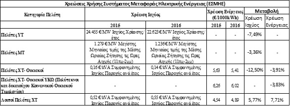 Για το έτος 2016, σε όλες τις κατηγορίες πελατών παρατηρείται μείωση τόσο της χρέωσης ισχύος όσο και της χρέωσης ενέργειας, σε σχέση με τις αντίστοιχες που ίσχυσαν για το 2015, πλην μίας κατηγορίας πελατών, στην οποία παρατηρείται μικρή αύξηση (Λοιποί πελάτες ΧΤ), η οποία αντισταθμίζει μερικώς την αντίστοιχη σημαντική μείωση που είχε επέλθει στην κατηγορία αυτή κατά την προηγούμενη αναπροσαρμογή των τιμολογίων. Οι νέες χρεώσεις χρήσης Συστήματος Μεταφοράς (ΕΣΜΗΕ) έχουν ως αποτυπώνονται στον πίνακα 5 και θα ισχύσουν από 1.2.2016.