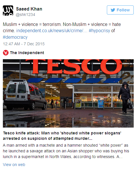 «Μουσουλμάνος + βία=τρομοκρατία. Μη μουσουλμάνος + βία=έγκλημα μίσους». Αυτό το tweet προκάλεσε πλημμυρίδα σχολίων στα κοινωνικά δίκτυα με αφορμή το περιστατικό που συνέβη το βράδυ του Σαββάτου σε σταθμό του μετρό στο ανατολικό Λονδίνο.