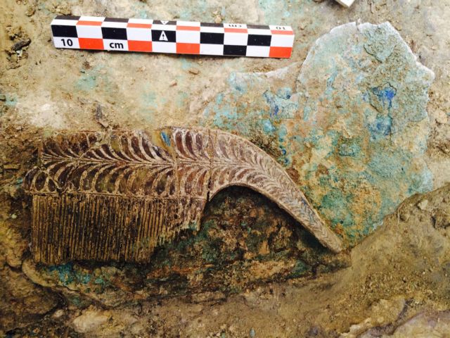 Η είδηση παρέμεινε κρυφή ώς τα τέλη Οκτωβρίου -και την ολοκλήρωση των ερευνών- για λόγους προστασίας των ευρημάτων. Δίπλα στον πολεμιστή βρέθηκαν, μεταξύ άλλων, ένα χάλκινο σπαθί με επιχρυσωμένη ελεφαντοστέινη λαβή, χρυσά σφραγιστικά δακτυλίδια και κύπελλα, μια σπάνια χρυσή αλυσίδα, ασημένια κύπελλα (ορισμένα με χρυσά χείλη), χάλκινα αγγεία και κύπελλα, περισσότεροι από πενήντα σφραγιδόλιθοι και περισσότερες από 1.000 ψήφους από πολύτιμους λίθους.