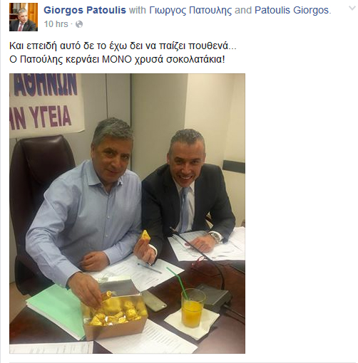 Την ανέβασε στον λογαριασμό του στο Facebook, με το σχόλιο:«Και επειδή αυτό δε το έχω δει να παίζει πουθενά… Ο Πατούλης κερνάει ΜΟΝΟ χρυσά σοκολατάκια!».