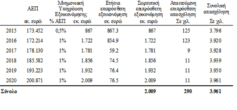 Πώς προκύπτει αυτό; Εάν υποθέσουμε πως το μέσο συνολικό (συμπεριλαμβανομένων εργοδοτικών εισφορών και εισφορών εργαζόμενου) κόστος ανά εργαζόμενο ανέρχεται σε €1.100 μηνιαίως (€15.400 ετησίως) και πως από το κόστος αυτό, το 45% κατευθύνεται προς το δημόσιο και ασφαλιστικούς φορείς, τότε για την περίοδο 2016 – 2018 αρκεί η εμπροσθοβαρής δημιουργία 290 χιλιάδων θέσεων εργασίας σε βάθος πενταετίας για την επίτευξη ισοδύναμων εσόδων κοινωνικής ασφάλισης με τις μνημονιακές περικοπές δαπανών που συμφωνήθηκαν.