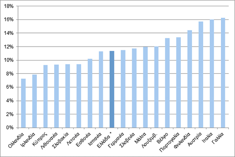 Σημείωση: * Το κόστος συντάξεων για την Ελλάδα αφορά εκτίμηση για το 2015 (της τάξης των 27 δισ. ευρώ, πηγή: ΗΔΙΚΑ) σε σχέση με το ΑΕΠ του 2009.