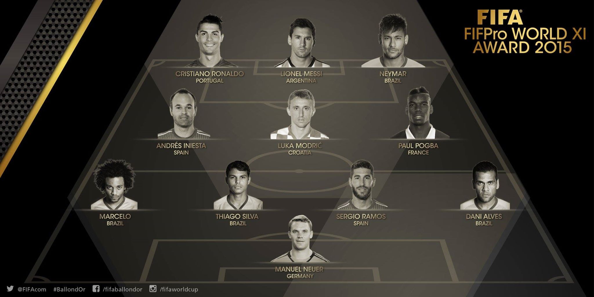 Όσον αφορά την κορυφαία ενδεκάδα για το 2015 την αποτελούν οι: Μανουέλ Νόιερ (Μπάγερν Μονάχου), Τιάγκο Σίλβα (Παρί Σεν Ζερμέν), Μαρσέλο (Ρεάλ Μαδρίτης), Σέρχιο Ράμος (Ρεάλ Μαδρίτης), Ντάνι Άλβες (Μπαρτσελόνα), Αντρές Ινιέστα (Μπαρτσελόνα), Λούκα Μόντριτς (Ρεάλ Μαδρίτης), Πολ Πογκμπά (Γιουβέντους), Νεϊμάρ (Μπαρτσελόνα), Λιονέλ Μέσι (Μπαρτσελόνα), Κριστιάνο Ρονάλντο (Ρεάλ Μαδρίτης).