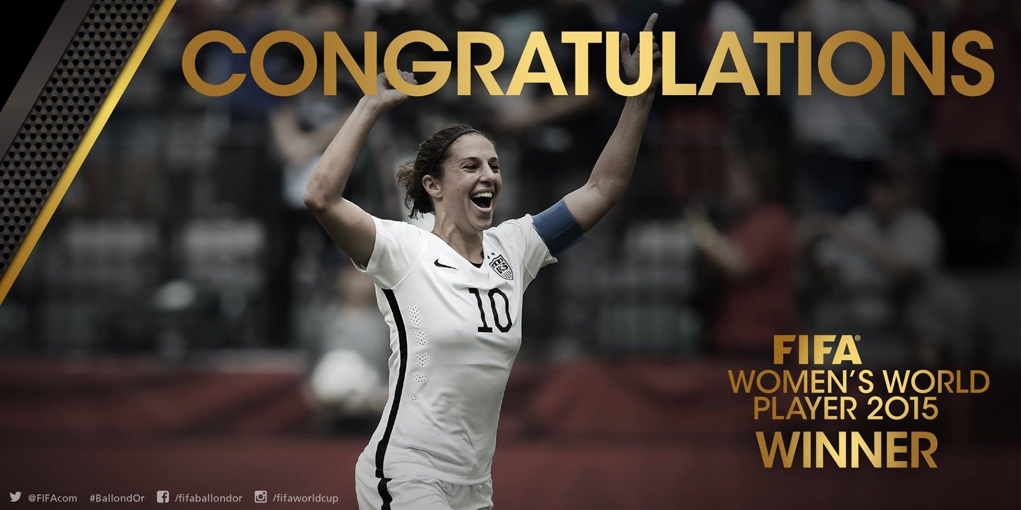 Τον αντίστοιχο τίτλο στις γυναίκες ως η καλύτερη του 2015 κατάκτησε η Κάρλι Λόιντ, διαδεχόμενη τη Γερμανίδα Ναντίνε Κέσλερ. Η αρχηγός της εθνικής ομάδας των ΗΠΑ ήταν η μεγάλη πρωταγωνίστρια στον τελικό του Μουντιάλ γυναικών που έγινε το καλοκαίρι του 2015 στον Καναδά, όπου με χατ τρικ οδήγησε το αντιπροσωπευτικό συγκρότημα της χώρας της στην κατάκτηση του τροπαίου στον τελικό με την Ιαπωνία (5-2). Η 27χρονη Γερμανίδα, Σάλια Σάσιτς, και η Αγια Μιγιάμα (Ιαπωνία) ήταν οι άλλες δύο υποψήφιες.