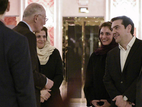 Σε ένα τρίτο στιγμιότυπο, η κ. Μπαζιάνα εμφανίζεται με μπορντό μαντήλα δίπλα στον κ.Τσίπρα στο ξενοδοχείο που διαμένει το πρωθυπουργικό ζεύγος στην Τεχεράνη.