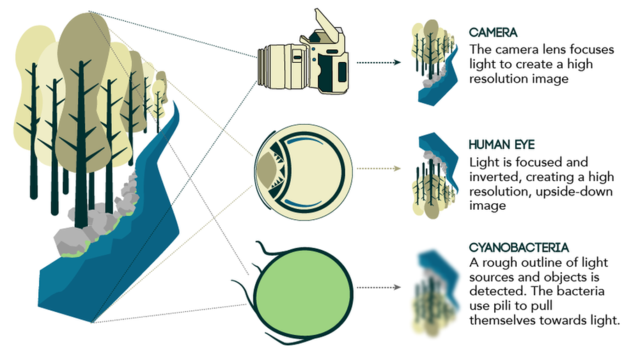 Τα κυανοβακτήρια (κάτω) δημιουργούν ένα αντεστραμμένο είδωλο όπως τα ανθρώπινα μάτια (μέση) Πηγή: eLife