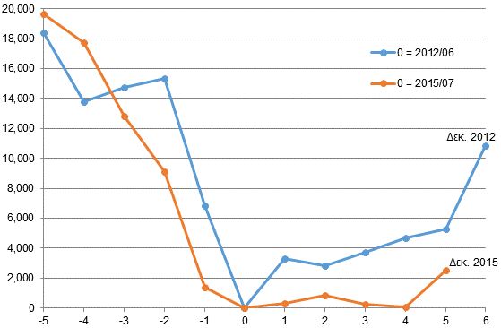 Διάγραμμα 1: Σωρευτική μεταβολή στις καταθέσεις επιχειρήσεων και νοικοκυριών σε σχέση με το σημείο 0 (Ιούνιος 2012 και Ιούλιος 2015, αντίστοιχα). Πηγή: ΤτΕ.