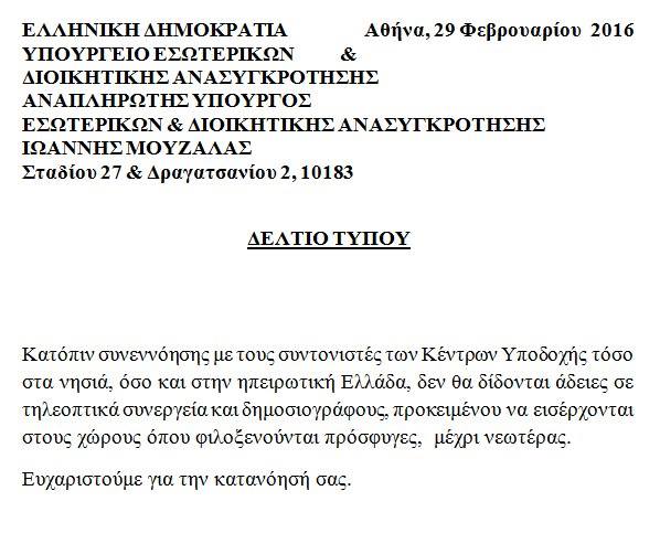 Η ανακοίνωση που εκδόθηκε από το γραφείο του αναπληρωτή υπουργού Γιάννη Μουζάλα, με ημερομηνία 29 Φεβρουαρίου 2016, αναφέρει: «Κατόπιν συνεννόησης με τους συντονιστές των Κέντρων Υποδοχής τόσο στα νησιά, όσο και στην ηπειρωτική Ελλάδα, δεν θα δίδονται άδειες σε τηλεοπτικά συνεργεία και δημοσιογράφους, προκειμένου να εισέρχονται στους χώρους όπου φιλοξενούνται πρόσφυγες, μέχρι νεωτέρας. Ευχαριστούμε για την κατανόησή σας.»