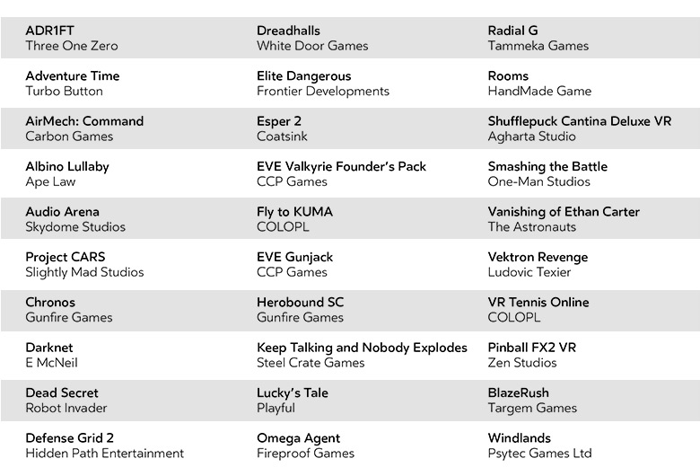 Αντίστοιχα, η Sony υποσχέθηκε ότι τρεις μήνες μετά την πρώτη κυκλοφορία του Playstation VR, δηλαδή στο τέλος του 2016, θα υπάρχουν 50 «πρότζεκτ VR» για αυτό, μεταξύ των οποίων τα ακόλουθα παιχνίδια VR: