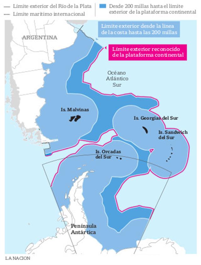 Σήμερα, επιτροπή του ΟΗΕ έκρινε ότι είναι νόμιμη η απόφαση του Μπουένος Αϊρες να επεκτείνει τα χωρικά ύδατα από τα 200 στα 350 μίλια από την ξηρά, προσθέτοντας 1,7 εκατομμύρια τετραγωνικά χιλιόμετρα στην επικράτειά της.