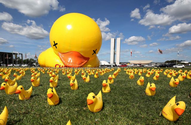 Στην πολιτική κρίση που σοβεί στη Βραζιλία, το αντικυβερνητικό στρατόπεδο έχει κινητοποιήσει διάφορα σύμβολα αλλά (για λόγο που θα εξηγηθεί παρακάτω), έχουν ξεχωρίσει τα κίτρινα παπάκια: Εμφανίζονται σε διαδηλώσεις, σε πλακάτ, ως στολές διαδηλωτών ενώ το αποκορύφωμα είναι ένα μεγάλο τέτοιο πλαστικό, φουσκωτό παπάκι που έχει στηθεί (με άλλα, μικρότερα) σε πάρκο με φόντο το Κογκρέσο.