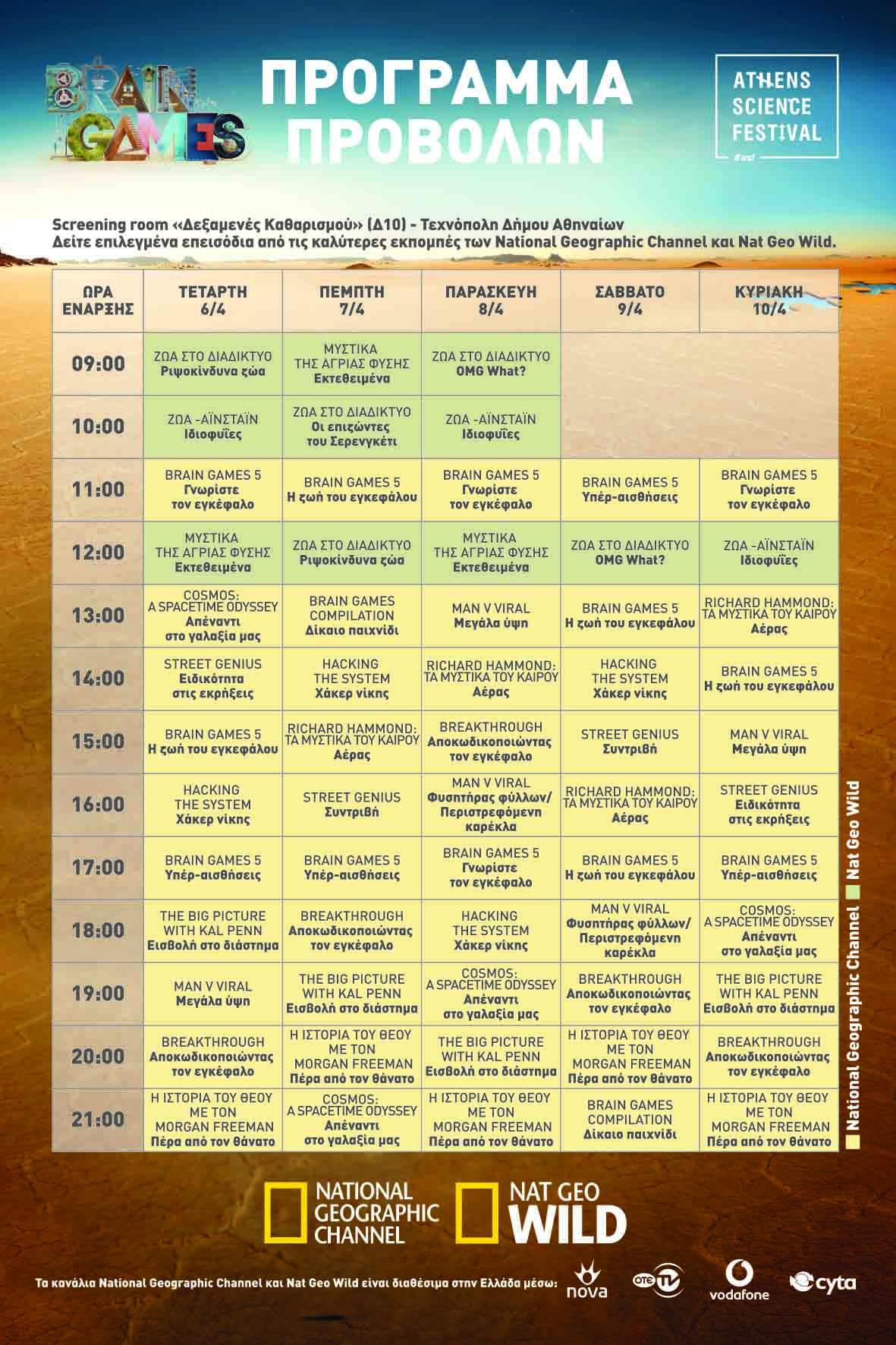 Για δεύτερη συνεχή χρονιά το National Geographic Channel, αποτελεί στρατηγικό συνεργάτη και συμμετέχει ενεργά στο Athens Science Festival. Από την Τετάρτη 6 έως και την Κυριακή 10 Απριλίου, ο ειδικά διαμορφωμένος χώρος του National Geographic Channel (Δεξαμενές Καθαρισμού, Δ10) στην Τεχνόπολη του Δήμου Αθηναίων, περιμένει μικρούς και μεγάλους να διασκεδάσουν με τα «Brain Games», δράσεις οι οποίες θα επιχειρήσουν να «μπερδέψουν» το μυαλό τους και να αποκαλύψουν τελικά πώς αυτό λειτουργεί. Η είσοδος είναι ελεύθερη.