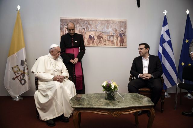 10:30: Στην κατ΄ιδίαν συνάντησή τους, ο πρωθυπουργός καλωσόρισε τον ποντίφικα στη Λέσβο, «το νησί που σήκωσε το βάρος της προσφυγικής κρίσης και της μεγαλύτερης μετακίνησης πληθυσμού μετά τον Β’ Παγκόσμιο Πόλεμο».