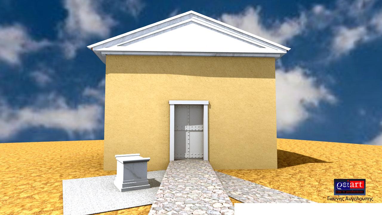 Η αψιδωτή του κάτοψη (10 περίπου μέτρα), το σχήμα του, η ύπαρξη ορθογώνιου μαρμαροθετημένου δαπέδου με κενή επιφάνεια-βωμό (1,30×1,70 μ.) είχαν προβληματίσει πολύ τον αρχαιολόγο ερευνητή, καθώς περιβάλλει επακριβώς έναν τετράγωνο βυζαντινό πύργο.