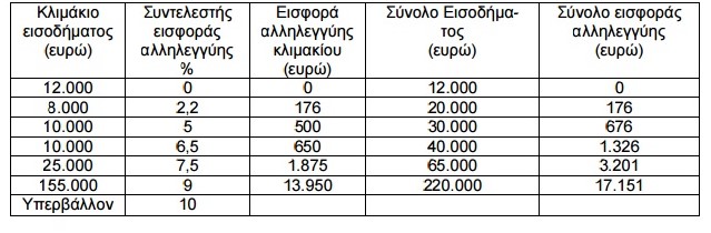 Υπενθυμίζει δε ότι (με τις διατάξεις της παρ.9 του άρθρου 112 του ν.4387/2016) η ειδική εισφορά αλληλεγγύης ενσωματώνεται στο ΚΦΕ. Συγκεκριμένα, με τις διατάξεις αυτές προστίθεται νέο άρθρο 43Α στον ν.4172/2013 και η παρακράτηση ειδικής εισφοράς αλληλεγγύης στο εισόδημα από μισθούς – συντάξεις (βάσει αναγωγής του μηνιαίου εισοδήματος σε ετήσιο καθαρό εισόδημα), διενεργείται σύμφωνα με την ακόλουθη κλίμακα και όχι με συντελεστές στο σύνολο του εισοδήματος όπως συνέβαινε στο παρελθόν: