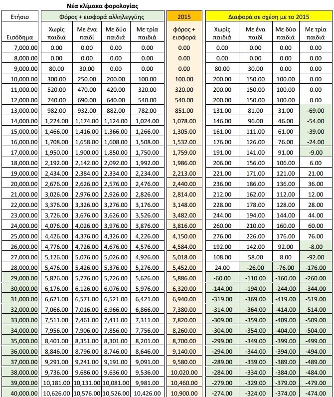 Αναλυτικό πίνακα με τις διαφορές που προκύπτουν για εισοδήματα από 7.000 έως 150.000 ευρώ βάσει των αλλαγών στις κλίμακες φορολογίας στο αφορολόγητο και την εισφορά αλληλεγγύης παρουσιάζει ο φορολογικός κόμβος taxheaven.gr σε εγχειρίδιομε όλες τις τελευταίες αλλαγές στη φορολογία.