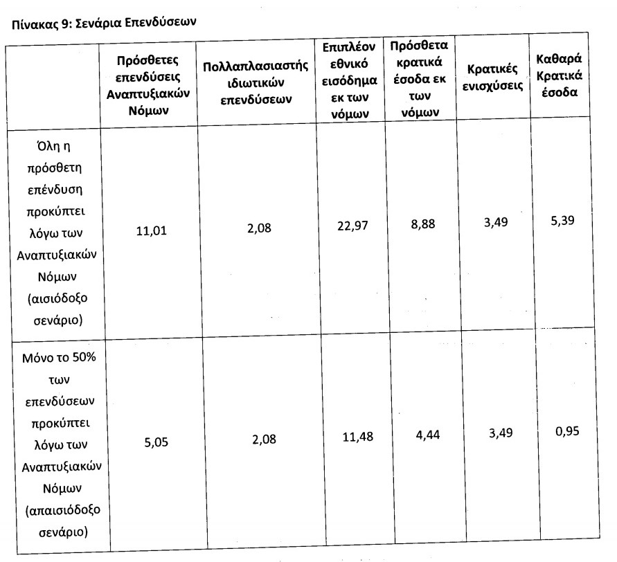 Αναλυτικά, ο μειωτικός παράγοντας, επισημαίνεται, σχετίζεται με το εξής. Η υπόθεση που γίνεται είναι ότι το σύνολο των 11,01 δισ. ευρώ επενδύσεων των Αναπτυξιακών Νόμων δεν θα προέκυπταν αν δεν ενισχύονταν κρατικά κάτι άλλωστε επιβεβλημένο και από τις ευρωπαϊκές οδηγίες. Παρ’ όλα αυτά σε κάθε περίπτωση η παραπάνω υπόθεση αποτελεί υπερεκτίμηση της πραγματικότητας. Είναι πιθανό ένας μέρος απ’ αυτές να γίνονταν έστω και χωρίς την κρατική ενίσχυση. Να σημειωθεί εδώ ότι ακόμα και «οι μισές από αυτές να προέκυπταν λόγω της κρατικής ενίσχυσης […] το αποτέλεσμα θα ήταν αυξητικό τόσο για το ΑΕΠ, όσο και για τα κρατικά έσοδα».