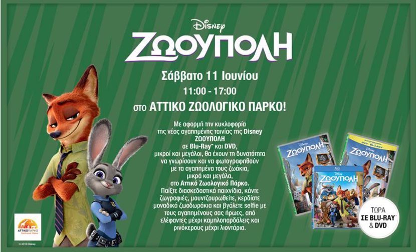 Με αφορμή την κυκλοφορία της νέας αγαπημένης ταινίας της Disney «Ζωούπολη» σε Blu-Ray και DVD, αλλά και ειδική συσκευασία Combo DVD & Blu-Ray, η Feelgood Entertainment σε συνεργασία με το Αττικό Ζωολογικό Πάρκο, προσκαλεί μικρούς και μεγάλους, το Σάββατο, 11 Ιουνίου και ώρες 11:00 – 17:00, να διασκεδάσουν, παρέα με τα αγαπημένα τους ζώα, στο φυσικό τους περιβάλλον.