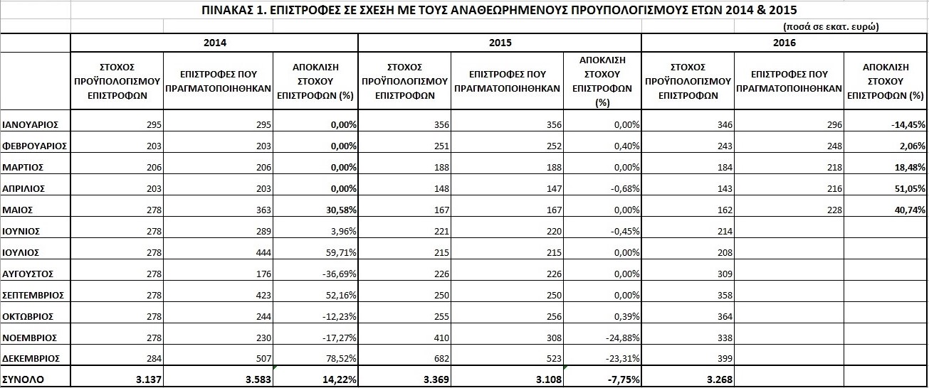 Όπως απεικονίζεται στον συνημμένο πίνακα 1, για την περίοδο Ιανουαρίου-Μαΐου 2016, οι στόχοι για επιστροφές φόρων (σύμφωνα με τους αναθεωρημένους προϋπολογισμούς των ετών 2014 και 2015), όχι μόνο έχουν επιτευχθεί, αλλά και ξεπεραστεί κατά μεγάλο ποσοστό. Για την περίοδο Ιανουαρίου-Μαΐου 2014, (εποχή του περίφημου success story), ο μέσος όρος των επιστροφών κυμαινόταν σε ποσοστό 6,11%, ενώ για το ίδιο διάστημα για το 2016, ο μέσος όρος έχει φτάσει ήδη το 18,57% και αναμένεται να αυξηθεί!