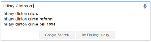 Για παράδειγμα, όταν κάποιος πληκτρολογήσει στη μηχανή αναζήτησης «Hillary Clinton cri» η Google προτείνει φράσεις αναζήτησης όπως «Hillary Clinton crime reform» και «Hillary Clinton crisis», όχι όμως «Hillary Clinton crimes», όπως αντιθέτως κάνει η ανταγωνιστική μηχανή αναζήτησης της Microsoft, η Bing.