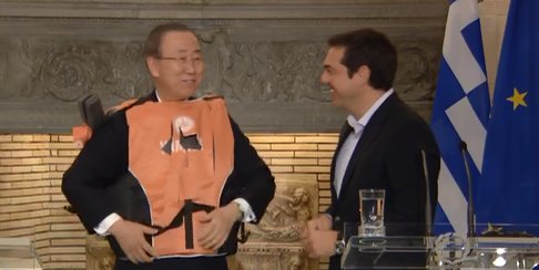 Ο κ. Τσίπρας χάρισε στον ΓΓ του ΟΗΕ ένα σωσίβιο, σημειώνοντας ότι πρόκειται για «εργαλείο ζωής» και εκφράζοντας την ελπίδα ότι δεν θα χρειαστεί να ξαναχρησιμοποιηθεί.