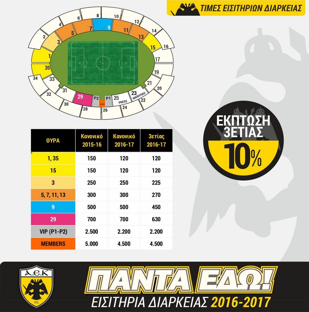 Επίσης, παραμένουν ως έχουν όλες οι εκπτωτικές κατηγορίες (ΑΜΕΑ, νέοι, άνω των 65), μειώνεται η τιμή του πάρκινγκ στα 50 ευρώ (από 60) και αυξάνονται οι παροχές για τους κατόχους διαρκείας από 16 εταιρείες-χορηγούς της ΠΑΕ.