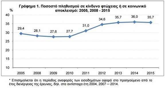 Το 35,7% του πληθυσμού της Ελλάδας βρίσκεται σε κίνδυνο φτώχειας ή κοινωνικού αποκλεισμού, σύμφωνα με την έρευνα της ΕΛΣΤΑΤ (για το 2015 με βάση τα εισοδήματα του 2014), ποσοστό που παραμένει ανησυχητικά υψηλό παρά τη μικρή μείωση που παρουσιάζει έναντι του προηγούμενου έτους.