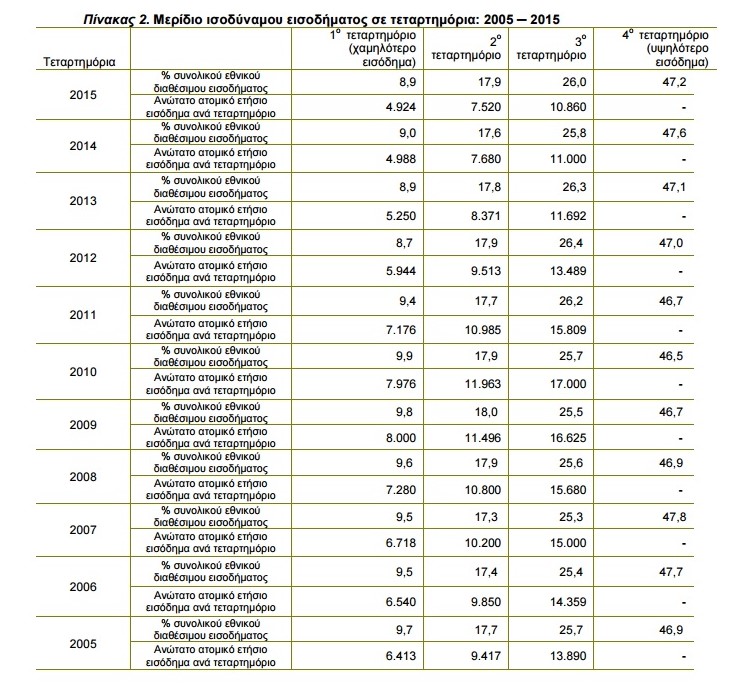 το 25% του πληθυσµού µε το υψηλότερο εισόδηµα (4ο τεταρτηµόριο) κατέχει το 47,2% του συνολικού εθνικού διαθέσιµου εισοδήµατος, δηλαδή ποσοστό µειωµένο κατά 0,4 ποσοστιαίες µονάδες σε σχέση µε το 2014